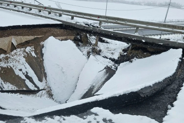 Дорожное полотно провалилось на въезде на виадук над платной федеральной дорогой. В регионе в середине весны выпал снег.