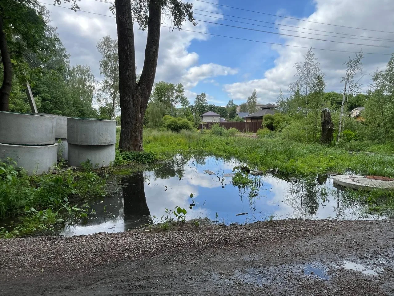 Для сравнения, так выглядел тот же участок на прошлой неделе. Водой была занята проезжая часть. На обочине стояли бетонные кольца будущих колодцев.