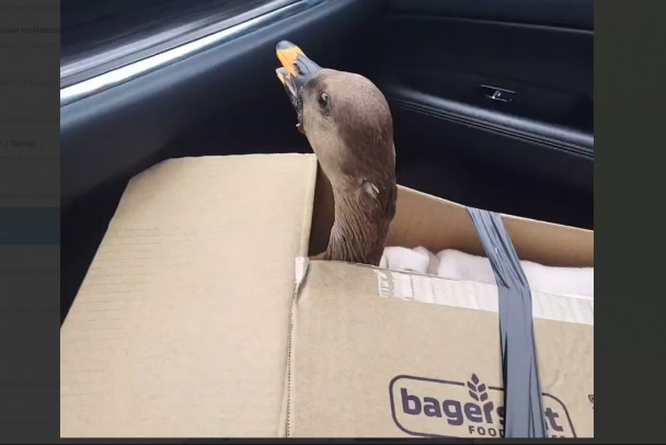 Судя по видео, гуся поместили в коробку и посадили в машину.