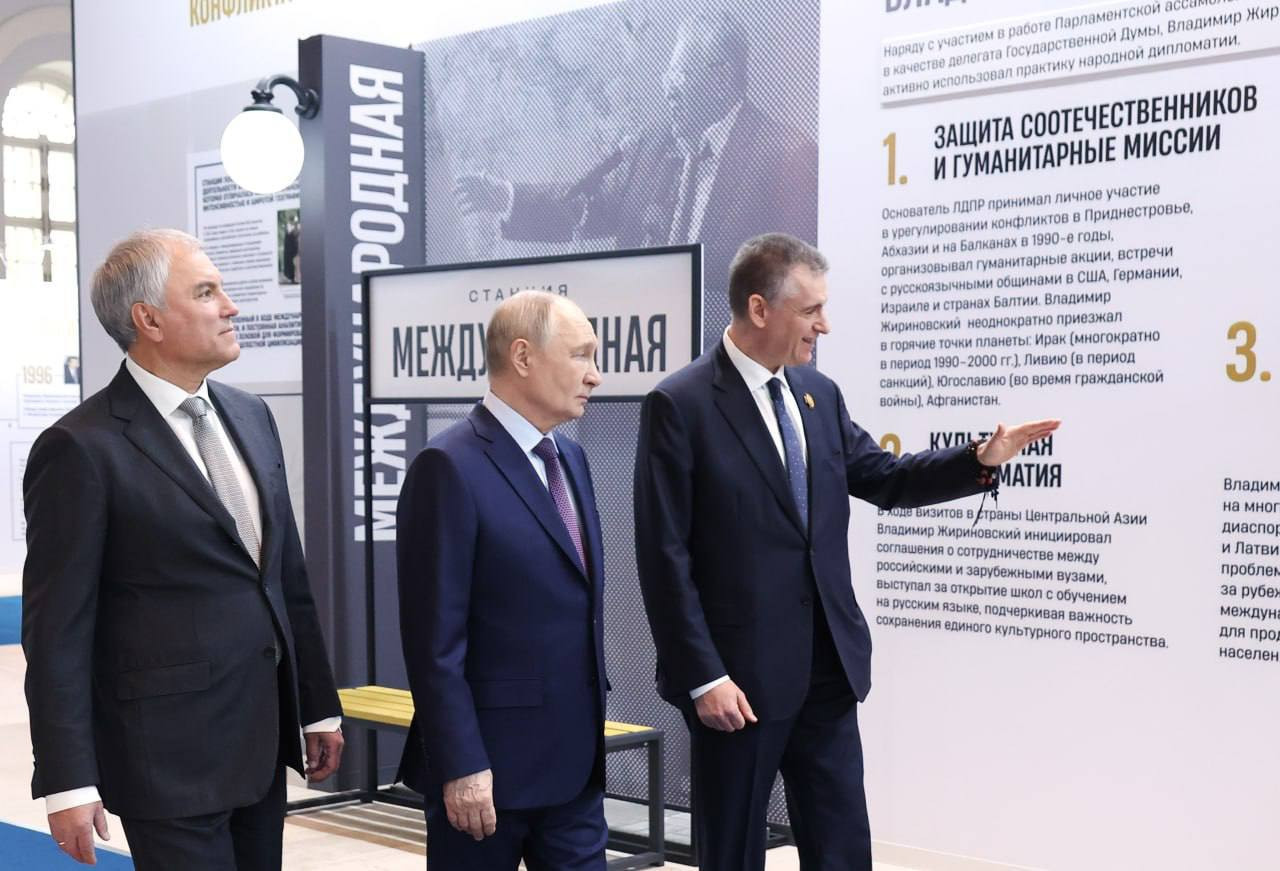 Накануне в столичном Манеже выставку о ярком и громком политике осмотрели президент РФ Владимир Путин, спикер Госдумы Вячеслав Володин и нынешний лидер ЛДПР Леонид Слуцкий. Экспозиция построена в формате агитационного поезда, в ней собраны фотографии, личные вещи, письма Жириновского.