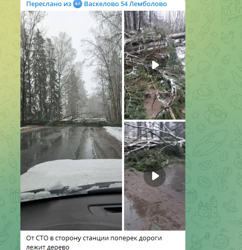 Деревья не выдержали напора ветра и мокрого снега во Всеволожском районе Ленобласти. В Петербурге, по словам местных, стволом придавило два автомобиля.