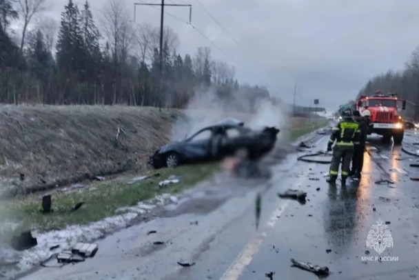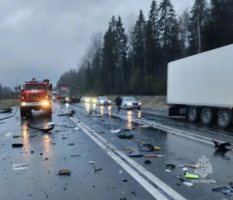 МЧС показало снимки с места лобового столкновения легкового и грузового автомобилей в Bолховском районе Ленобласти.