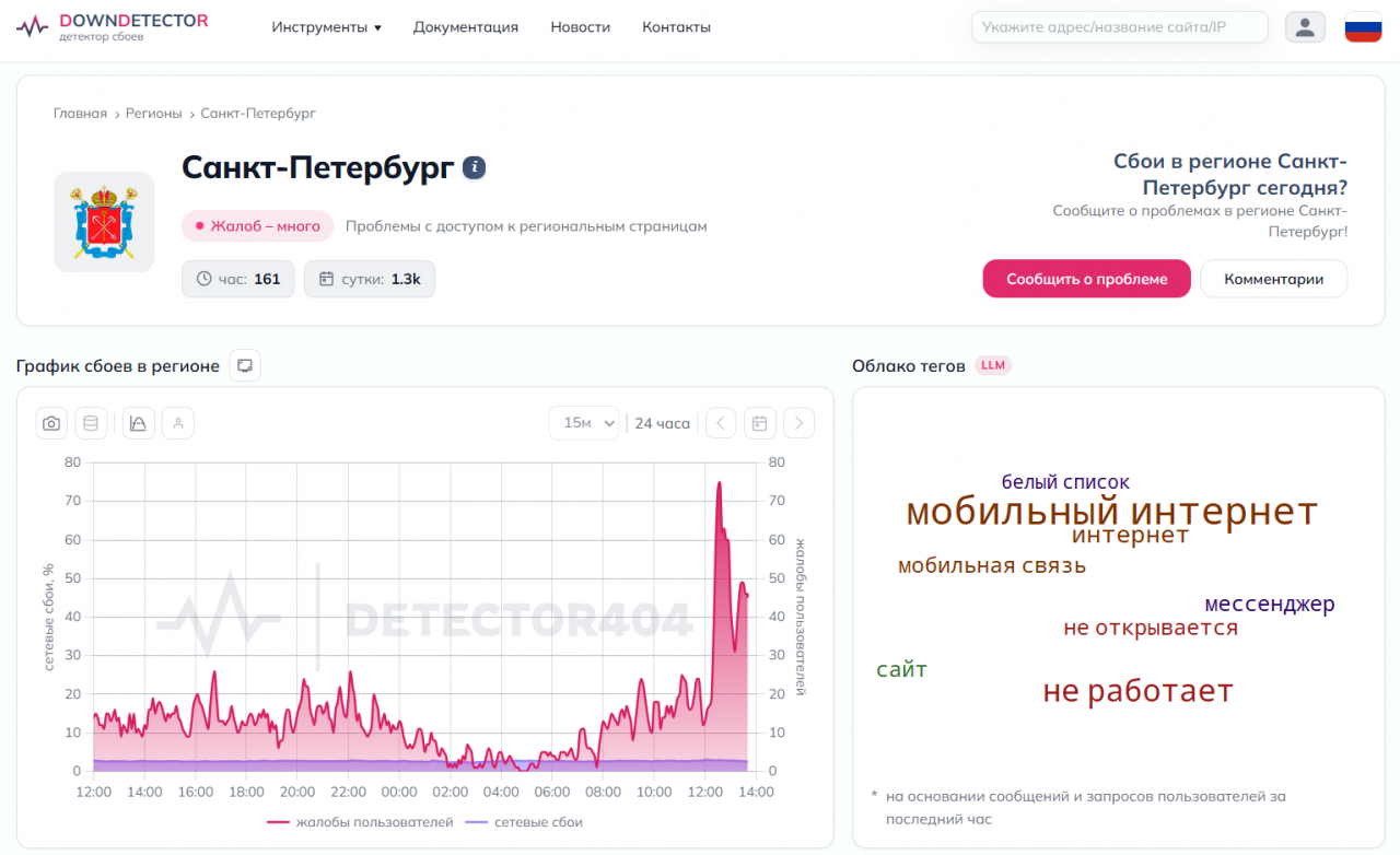 Как следует из данных на сайте Downdetector404 27 апреля, в Петербурге граждане сообщают о проблемах с работой мобильного интернета и связи, мессенджеры и сайты не открываются. За сутки поступило 1,3 тыс. жалоб, за час - 161.