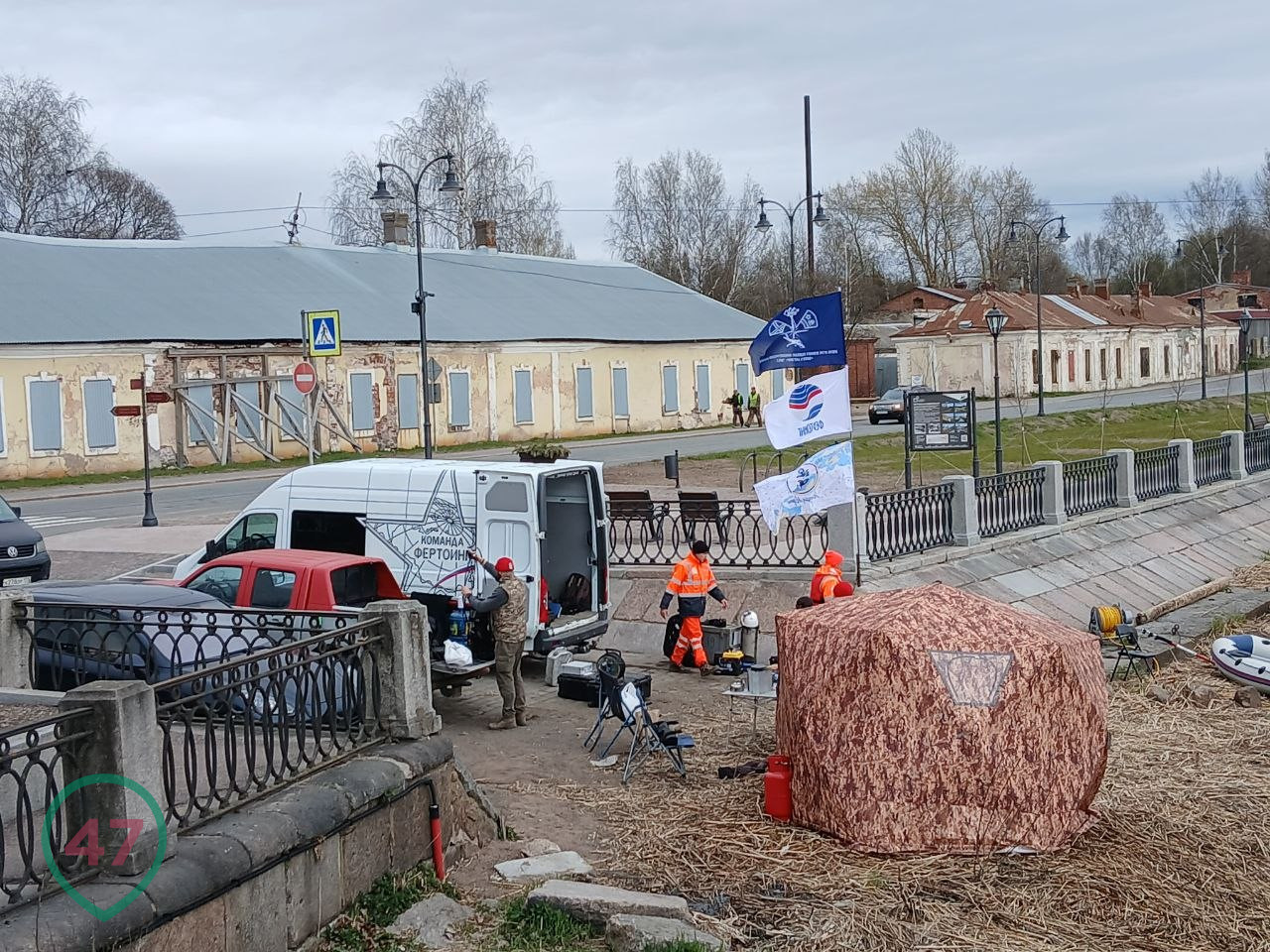 Это совместный проект фонда "Люди моря", подводно-археологической экспедиции "Память Балтики" и компании "Фертоинг" при поддержке музея. На утренних кадрах можно увидеть, что на месте припаркованы машины, ходят люди в спецкостюмах, установлены палатка и стулья. Рядом находится лодка.